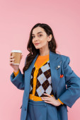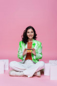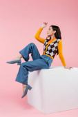 cheerful woman in blue pants and orange cardigan sitting on white cube and waving hand isolated on pink