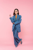 full length of pretty woman in trendy cardigan and blue pants leaning on white cube on pink background