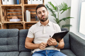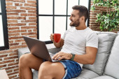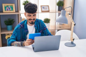 Zdjęcie "młody Hiszpan za pomocą laptopa siedzi na stole w domu" może być wykorzystywane do celów osobistych i komercyjnych zgodnie z warunkami zakupionej licencji Royalty-free. Obraz jest dostępny do pobrania w jakości wysokiej rozdzielczości do 5760x3840.