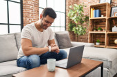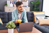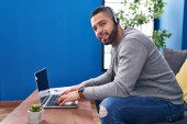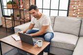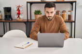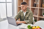 młody Hiszpan za pomocą laptopa siedzi na stole w domu
