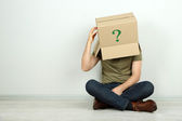 biznesmen gestykulacji z kartonu na głowę z pytania