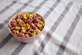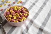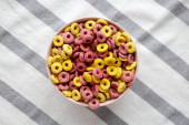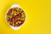 Kolorowe płatki z pełnym mlekiem na śniadanie. Płaskie ułożenie, nad głową, z góry.
