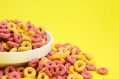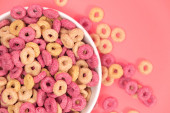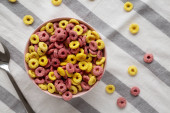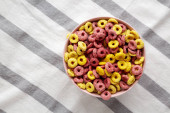 Kolorowe płatki z pełnym mlekiem na śniadanie. Leżał płasko, nad głową, z góry. Przestrzeń kopiowania.