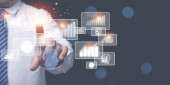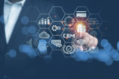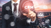 CRM, koncepcja zarządzania relacjami z klientami. Biznesmen dotykający wirtualnego ekranu w internecie marketingu biznesowego. Satysfakcja, komunikacja przez internet online.