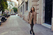 młoda kobieta z długimi włosami w beżowych spodniach, przycięta bluzka i torebka z paskiem na łańcuszku spaceru w pobliżu nowoczesnego budynku, zaparkowane samochody i zielone drzewa na ulicy miejskiej, turysta w Stambule