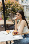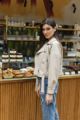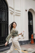 ładna kobieta z długimi brunetkami włosy i makijaż trzymając papierowy kubek z kawą i gazetą podczas spaceru w modnym stroju z torebką na miejskiej ulicy w pobliżu metalowego ogrodzenia i roślin w Stambule