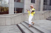 uśmiechnięta kobieta z długimi brunetkami włosy i makijaż trzymając papierowy kubek z kawą i gazetą podczas spaceru w modnym stroju i torebce na miejskiej ulicy w pobliżu metalowego ogrodzenia i białej ściany w Stambule