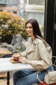 elegancka kobieta z długimi włosami trzymająca papierową filiżankę z kawą i gazetą podczas spaceru w modnym stroju z torebką na łańcuszku i uśmiechem na miejskiej ulicy w pobliżu niewyraźnej kwiaciarni w Stambule