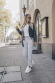 stylowa kobieta z długimi włosami w modnym stroju z beżowymi spodniami, przyciętą bluzką i torebką z paskiem na łańcuszku spacerującym po przejściu z kawą na miejskiej ulicy z rozmytym budynkiem w Stambule