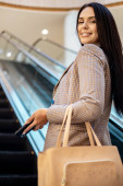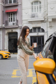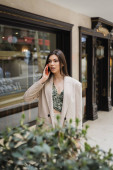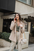 piękna kobieta z brunetka długie włosy i makijaż uśmiechnięty podczas rozmowy na smartfonie i stojąc w modnym stroju z torebką na pasku łańcucha w pobliżu rozmyte fantazyjne restauracja w Stambule