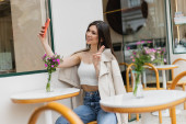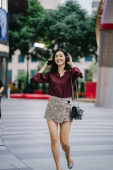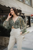 Zdjęcie "piękna kobieta z brunetka długie włosy i makijaż uśmiechnięty podczas rozmowy na smartfonie i stojąc w modnym stroju z torebką na pasku łańcucha w pobliżu rozmyte fantazyjne restauracja w Stambule " może być wykorzystywane do celów osobistych i komercyjnych zgodnie z warunkami zakupionej licencji Royalty-free. Obraz jest dostępny do pobrania w jakości wysokiej rozdzielczości do 5760x3840.