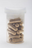 Organizator pigułek z witaminami, minerałami, błonnikiem, kwasami tłuszczowymi, aminokwasami, probiotykami na białym tle.
