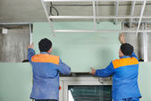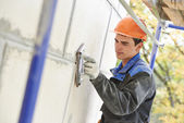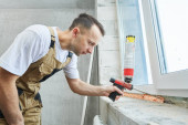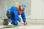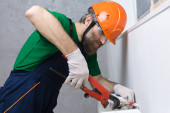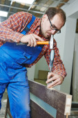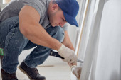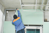 Stolarz z płytą gipsowo-kartonową i śrubokrętem