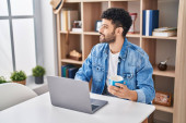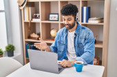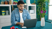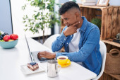 Young latin man using laptop having breakfast at home