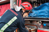 Strażacy korzystający z narzędzi hydraulicznych podczas szkolenia akcji ratunkowej. Ratownicy odblokowują pasażera w samochodzie po wypadku. Wysokiej jakości zdjęcia.