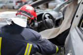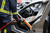 Zdjęcie "Strażacy korzystający z narzędzi hydraulicznych podczas szkolenia akcji ratunkowej. Ratownicy odblokowują pasażera w samochodzie po wypadku. Wysokiej jakości zdjęcia." może być wykorzystywane do celów osobistych i komercyjnych zgodnie z warunkami zakupionej licencji Royalty-free. Obraz jest dostępny do pobrania w jakości wysokiej rozdzielczości do 5760x3840.