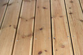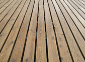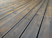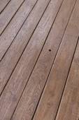 Częściowo pomalowane i częściowo oczyszczone tarasy z drewna polerowanego impregnowanego olejem. Pokładanie desek drewnianych