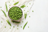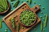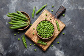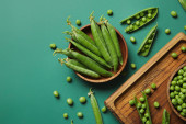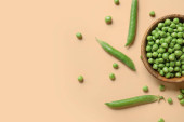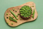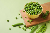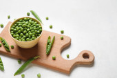 Miska i deska drewniana ze świeżym zielonym groszkiem na białym tle
