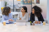 optymistyczne kobiety siedzące z notebookiem i drinkiem na wynos i uśmiechnięte bliskie przyjaciółki na niewyraźnym pierwszym planie podczas komunikacji w klubie interesów, dzielenia się wiedzą i koncept towarzyski