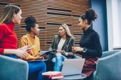 Zdjęcie "młoda wytatuowana kobieta trzymająca się za ręce szczęśliwej afrykańskiej dziewczyny w pobliżu uśmiechniętej rudej psycholog siedzi z drinkiem na wynos w papierowej filiżance, rozwiązując problemy i mentalnej koncepcji wellness" może być wykorzystywane do celów osobistych i komercyjnych zgodnie z warunkami zakupionej licencji Royalty-free. Obraz jest dostępny do pobrania w jakości wysokiej rozdzielczości do 5760x3840.