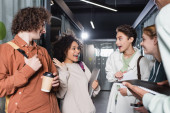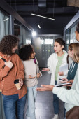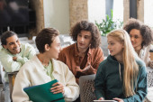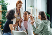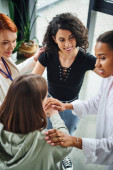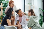 rudowłosy trener motywacji i młodzi wielonarodowi przyjaciele uspokajający rozczarowaną wielorasową kobietę podczas terapii wspomagającej w gabinecie konsultacyjnym, rozwiązywania problemów i mentalnej koncepcji odnowy biologicznej