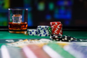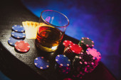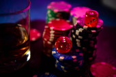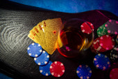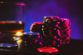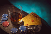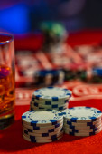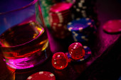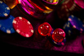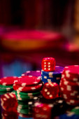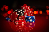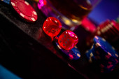 Kości siedzą na żetonach hazardu na czarnej drewnianej powierzchni. Zamazane tło. Kości na rozmytym tle bokeh.