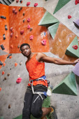 Afrykański amerykański atleta w pomarańczowej koszuli w pobliżu ściany wspinaczkowej z rękami skrzyżowanymi na klatce piersiowej