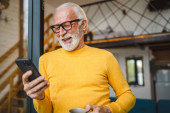 Portret starszego mężczyzny z brodą biznesmen w garniturze stoisko na świeżym powietrzu przed nowoczesnym budynku korporacji za pomocą telefonu komórkowego smartfona nawiązać rozmowę telefoniczną prawdziwa osoba kopia przestrzeni