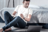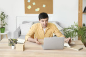 Zdjęcie "młody kręcone transgender blogger za pomocą laptopa i siedzi na łóżku w pobliżu smartfona i słuchawek" może być wykorzystywane do celów osobistych i komercyjnych zgodnie z warunkami zakupionej licencji Royalty-free. Obraz jest dostępny do pobrania w jakości wysokiej rozdzielczości do 5760x3840.