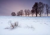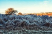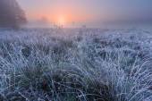 Piękny poranek z szron na roślinach. Jesienny krajobraz.