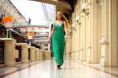 młoda kobieta w czerwonej sukience spaceru w sklepie