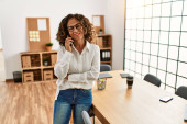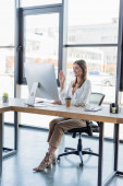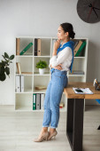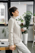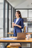Nowoczesna bizneswoman stoi pewnie przed eleganckim stołem we współczesnym biurze.