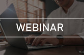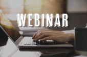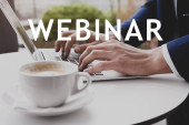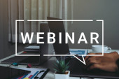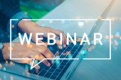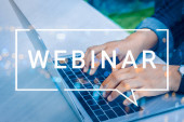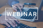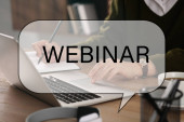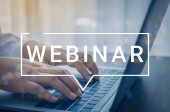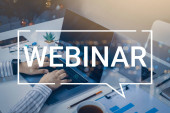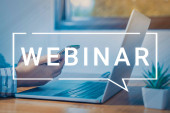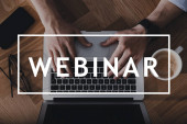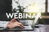 Internetowe webinarium. Kobieta korzystająca z laptopa przy białym stole, zbliżenie