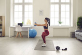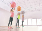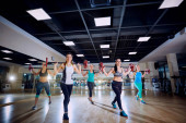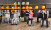 Zdjęcie "Grupa dopasowania i aktywnej grupy kobiet robi ćwiczenia sportowe na siłowni. Szczęśliwe uśmiechnięte kobiety w odzieży sportowej ćwiczące razem w domu. Sport trening, ćwiczenia i koncepcja fitness." może być wykorzystywane do celów osobistych i komercyjnych zgodnie z warunkami zakupionej licencji Royalty-free. Obraz jest dostępny do pobrania w jakości wysokiej rozdzielczości do 5760x3840.