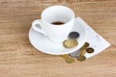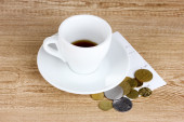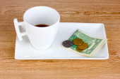 pusty kubek kawy z 5 dolarów wskazówka na drewniane tła