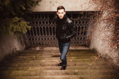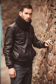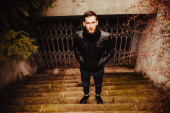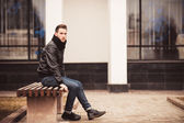 Pewny siebie mężczyzna pozujący w dżinsach selvedge