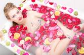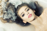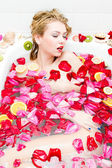 zbliżenie na oczy zamknięte dziewczyna pinup elegancka panienka z jedwabiu skóry, doskonałe blond włosy, zmysłowe usta czerwone usta otwarte w przyjemność zabawa zadowolony, relaks, układanie w czystej wodzie kopia tło