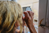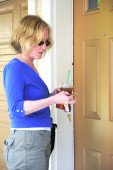 kobieta próbowała otworzyć drzwi do jej domu z powodu ciężkiej wody butelkowanej, ona trzyma