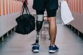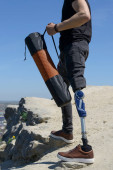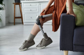 Młody mężczyzna siedzi na schodach z filiżanką kawy, pokazując swoją protezę nogi i swobodny styl.