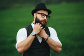 człowiek z brodą, myślenia w polu w pobliżu krzesło