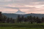 Zdjęcie lotnicze porannej atmosfery na wsi z bardzo majestatycznym widokiem na górę Merapi widocznym w oddali. Poranna atmosfera na wsi z wulkanem w tle