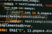 Widok z bliska kodu komputera C, składni Java, podświetlone w typowych kolorach edytora kodowania na ekranie w neutralnym tle, ewentualnie przenosząc technologii, programowania lub rozwoju oprogramowania