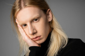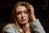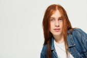 Zdjęcie "Przystojny młody facet z długimi włosami jest zagubiony w myślach podczas gdy w domu w stylowym ubraniu casual." może być wykorzystywane do celów osobistych i komercyjnych zgodnie z warunkami zakupionej licencji Royalty-free. Obraz jest dostępny do pobrania w jakości wysokiej rozdzielczości do 5760x3840.
