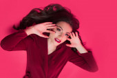 Elegancka brunetka pozuje z wdziękiem w studio na spokojnym szarym tle.