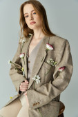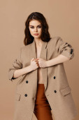 Piękna młoda kobieta z długimi brązowymi włosami ubrana w stylowy płaszcz z naturalnymi elementami