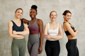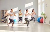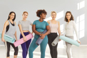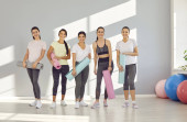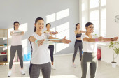 Zdjęcie "Sportowa grupa młodych szczęśliwych wieloetnicznych dziewcząt pokazujących mięśnie ćwiczące jogę, lekcja fitness z instruktorem, pozycja do ćwiczeń na stojąco, ćwiczenie, trening studentów w studio klubowym, dopasowanie szczupłych przyjaciół" może być wykorzystywane do celów osobistych i komercyjnych zgodnie z warunkami zakupionej licencji Royalty-free. Obraz jest dostępny do pobrania w jakości wysokiej rozdzielczości do 5760x3840.