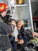 Szczęśliwy strażaków rozmawiając przez Wóz Strażacki