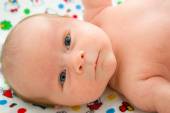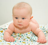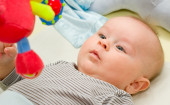 Toddler chłopiec z szeroko otwartymi oczami r. w łóżku z jasnym grzechotka z tworzyw sztucznych