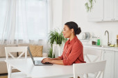 Młody człowiek koncentruje się na nauce w domu, korzystając z komputera w przytulnym otoczeniu..