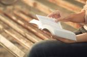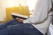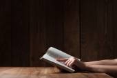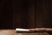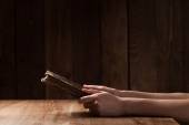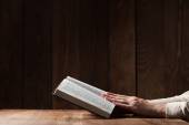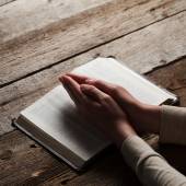 kobieta czytająca Biblię w ciemności na drewnianym stole